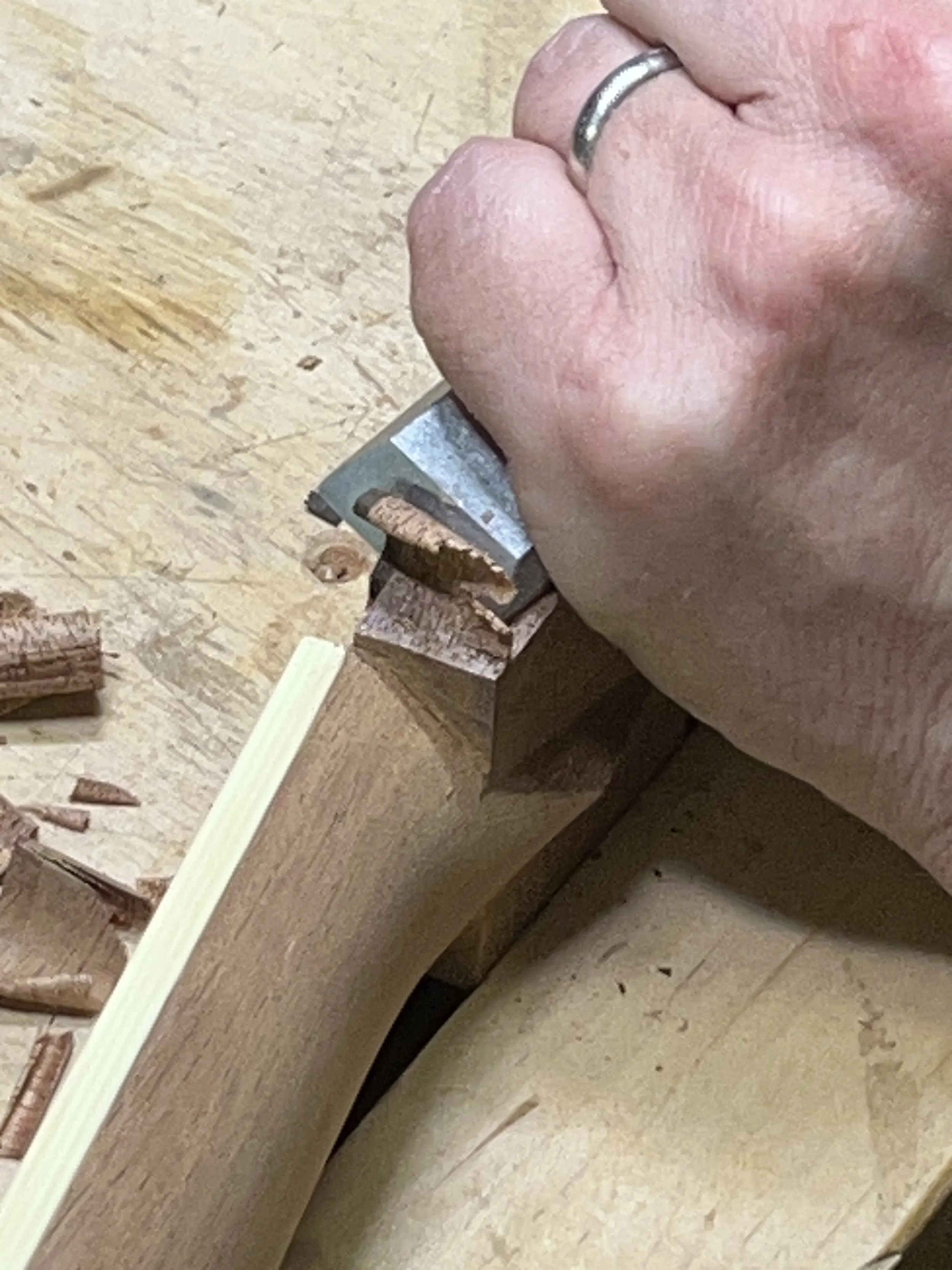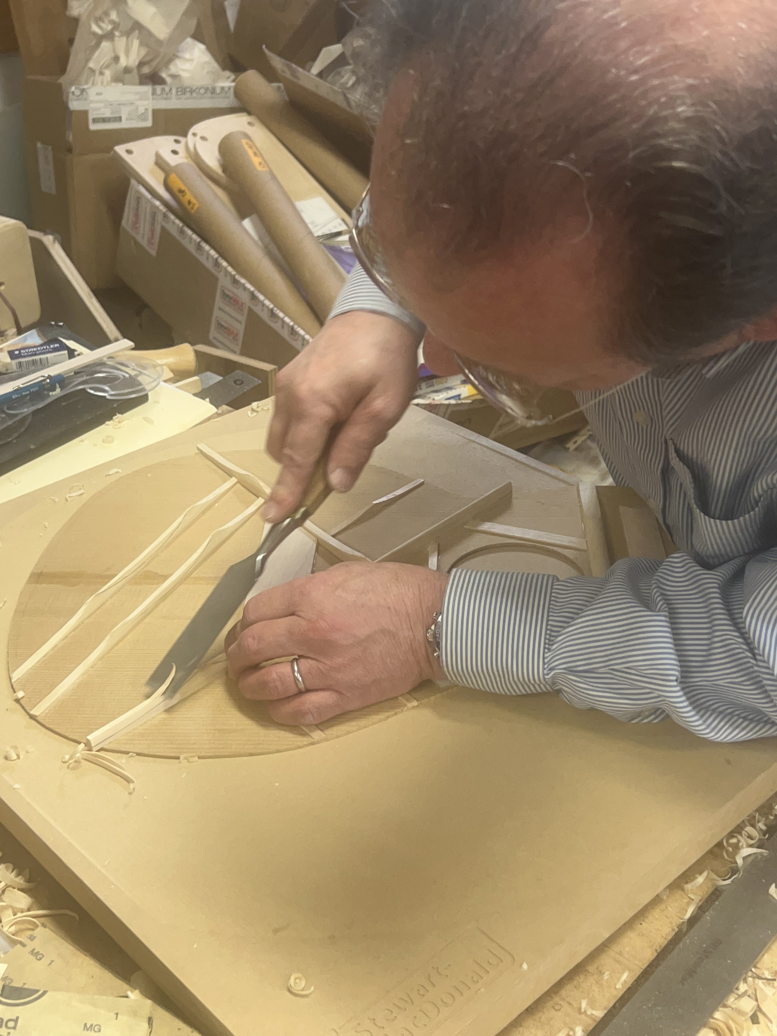 Shaping and carving the bracing on the soundboard and top to final dimensions to achieve acoustic tonal qualities desired for this guitar.