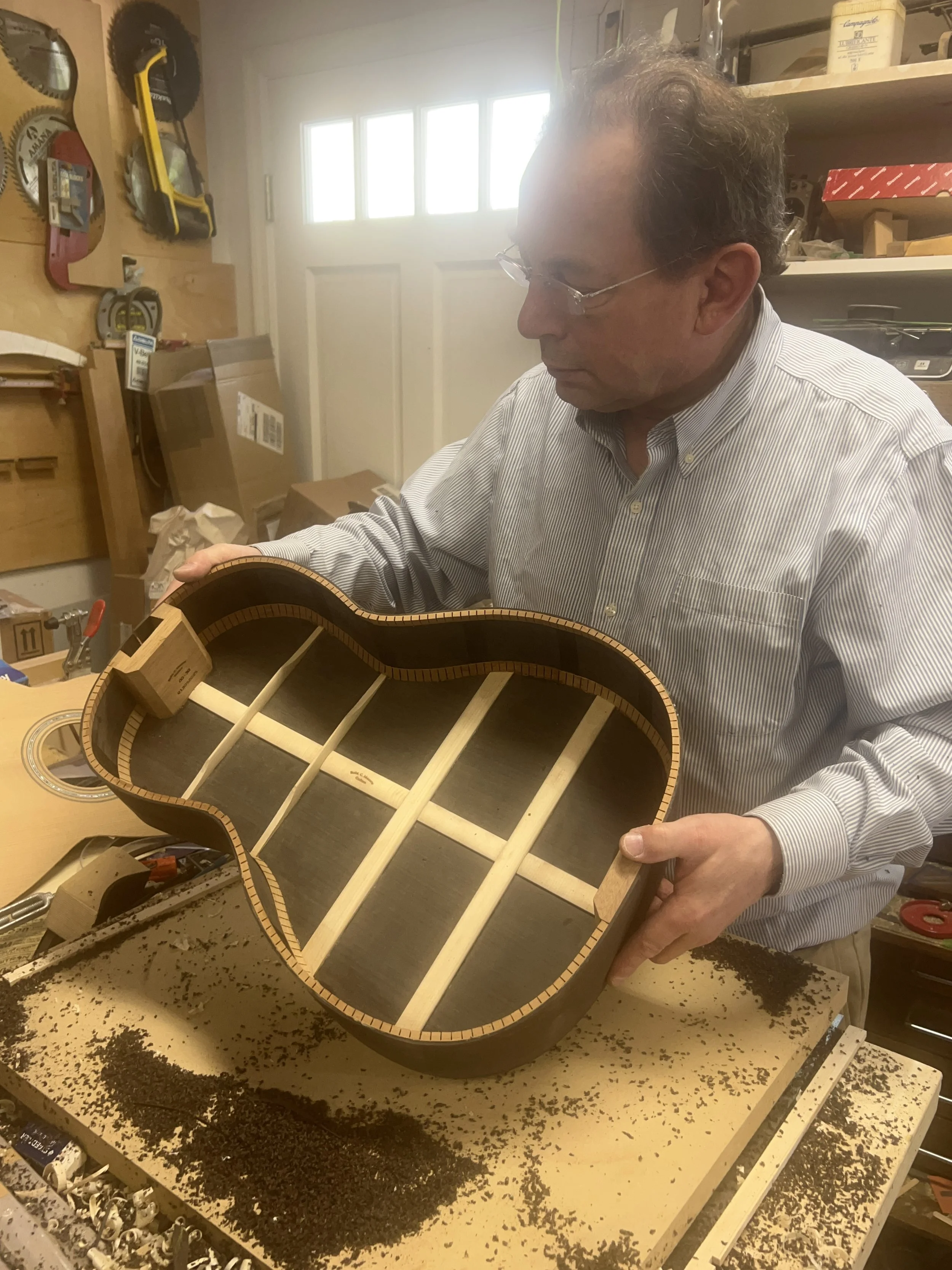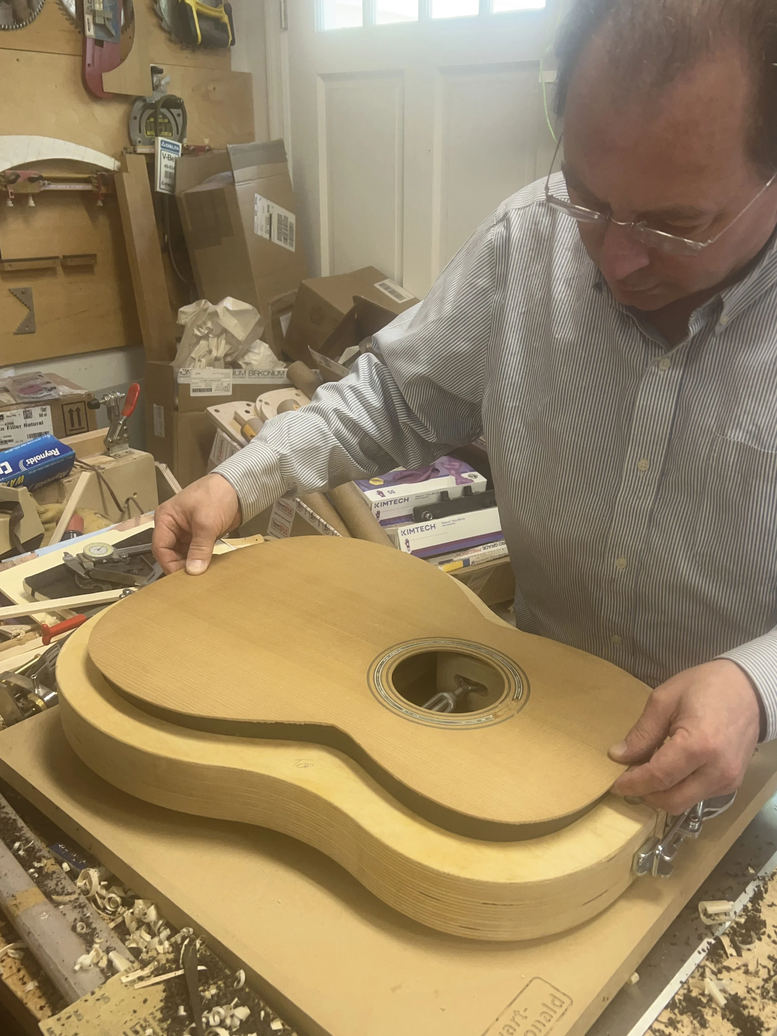 Inspecting the glued back and sides before attaching the soundboard/top.