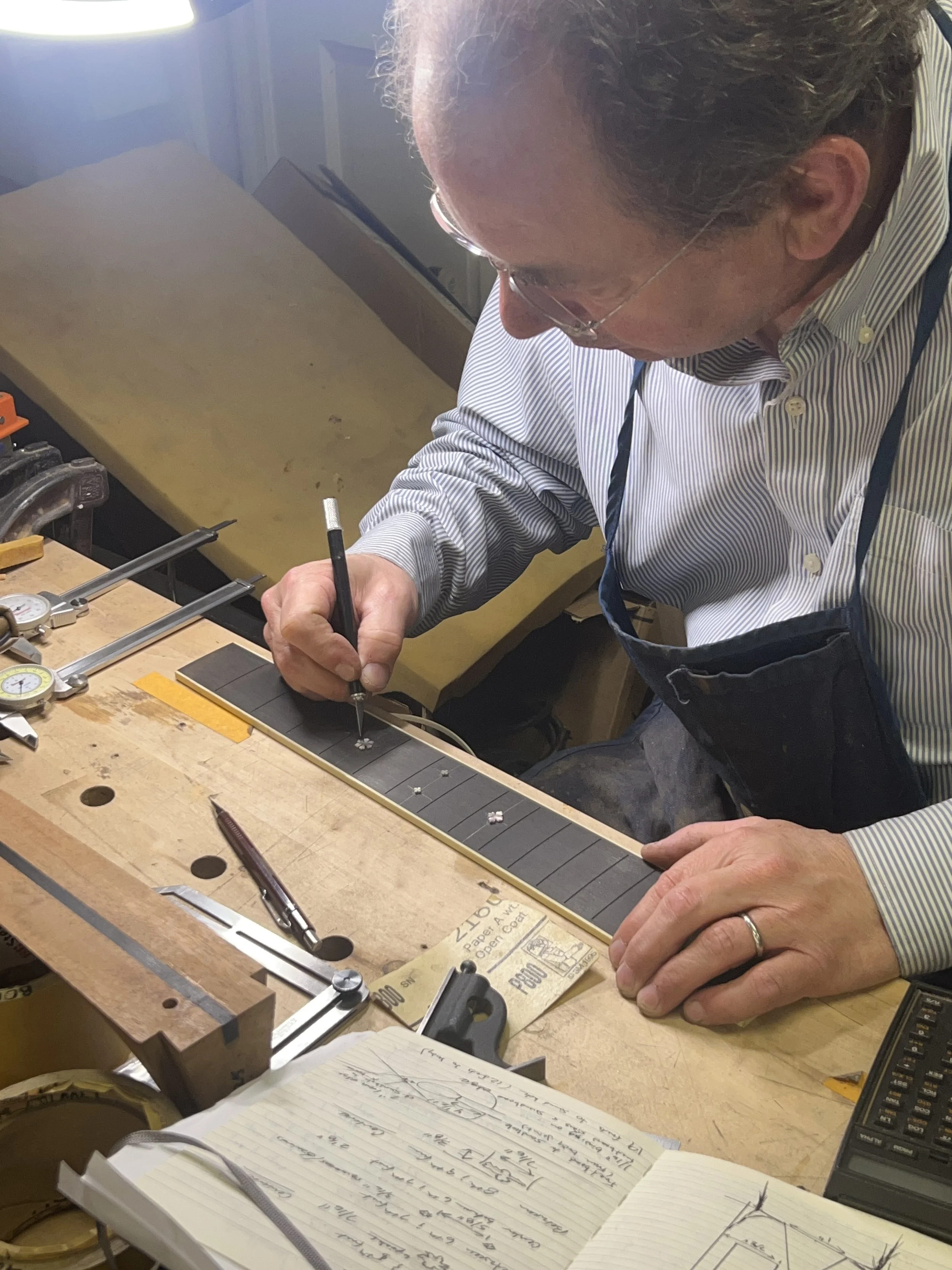 Laying out the abalone pearl fret markers on the fret board for inlay.