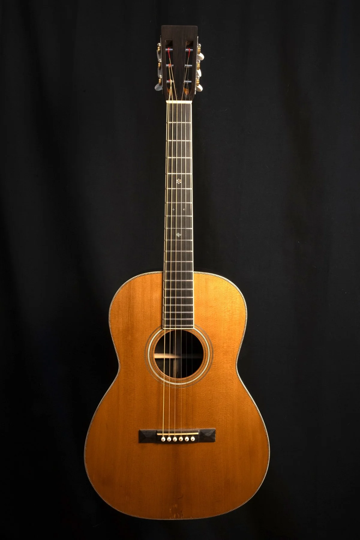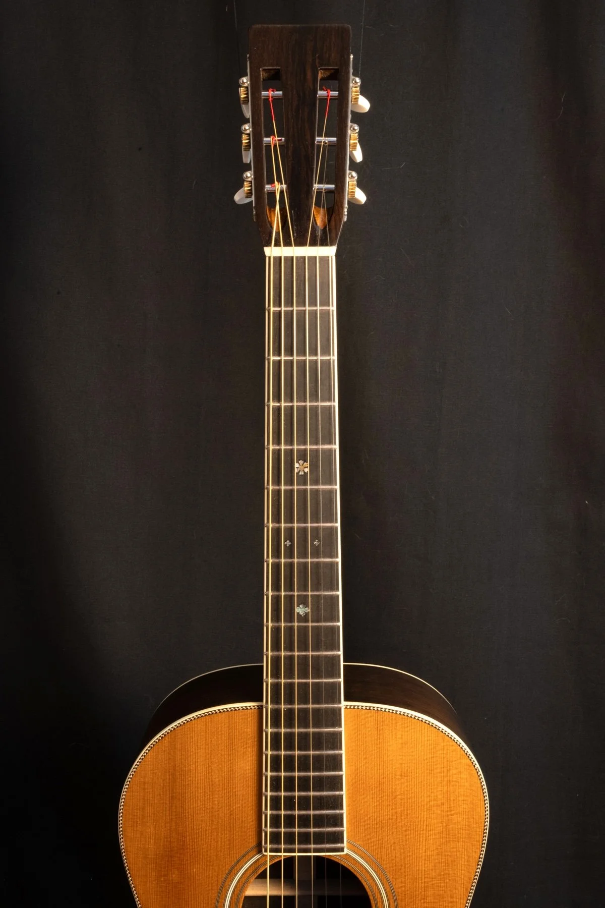 Fretboard: Ebony with Abalone Snowflake and Diamond Fret Inlays, 1 7/8” width at the nut and 2 5/16” width at the 12th fret